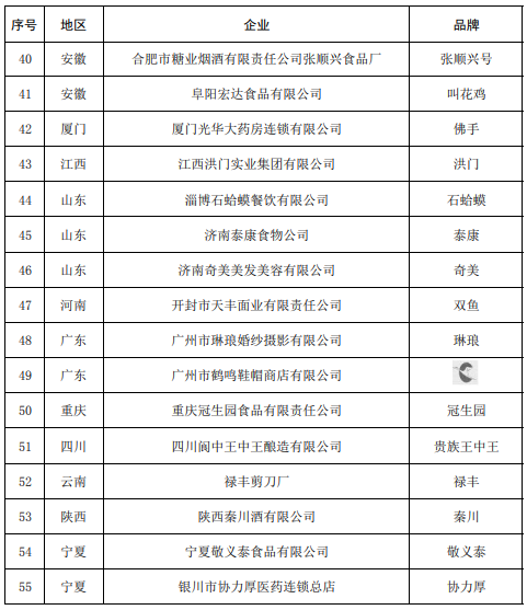 根据《通知》,55个没有通过中华老字号复核的品牌包括北京华女、天津稻香村、山西宝兴善、内蒙古大盛魁、大连群英楼、黑龙江正阳河、上海老半斋、山东泰康、河南双鱼、广东琳琅、重庆冠生园、云南禄丰、陕西秦川、宁夏敬义泰等。