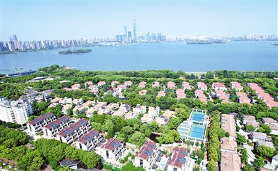 江苏省苏州市近年持续推动生态文明建设,有效改善城区河湖水质,构建绿色生态宜居城市。图为坐落在苏州市金鸡湖畔的居民住宅区。